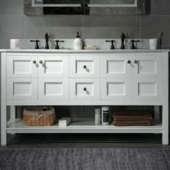 Sydney 60″Bathroom Vanity With Authentic Italian Carrara Marble Top 8″ Faucet Holes|Double Rectangle Undermount Sinks|2 Soft Closing Doors And 4 Full Extension Dovetail Drawers | White Vanity Color|