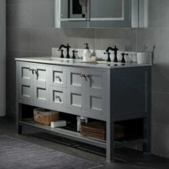 Sydney 60″Bathroom Vanity With Authentic Italian Carrara Marble Top 4″ Faucet Holes|Double Rectangle Undermount Sinks|2 Soft Closing Doors And 4 Full Extension Dovetail Drawers | Grey Vanity Color|