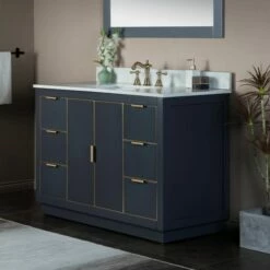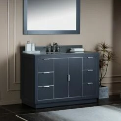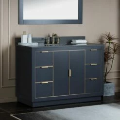 WOODBRIDGE Venice 48″x21″x33″ Solid Wood Bath Vanities Side Cabinet In Navy Blue With Gold And Engineered Stone Composite Vanity Top In Dark Gray With 3 Pre-Drilled Holes For 8-inch Widespread Faucet.