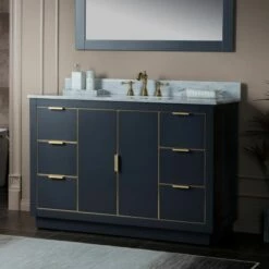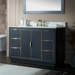 WOODBRIDGE Venice 48″x21″x33″ Solid Wood Bath Vanities Side Cabinet In Navy Blue With Gold Trim And Engineered Stone Composite Vanity Top In Carrara White 3 Pre-Drilled Holes For 8-inch Widespread Faucet.