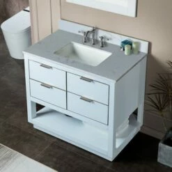 WOODBRIDGE Venice 48″x21″x33″ Solid Wood Bath Vanities Side Cabinet In Grey With Brushed Nickel Trim And Engineered Stone Composite Vanity Top In Fish Belly White With 3 Pre-Drilled Holes For 8-inch Widespread Faucet.