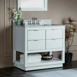 WOODBRIDGE Venice 42″x21″x33″ Solid Wood Bath Vanities Side Cabinet In White With Brushed Nickel Trim And Engineered Stone Composite Vanity Top In Carrara White 3 Pre-Drilled Holes For 8-inch Widespread Faucet.