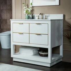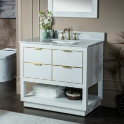 WOODBRIDGE Venice 42″x21″x33″ Solid Wood Bath Vanities Side Cabinet In White With Gold Trim And Engineered Stone Composite Vanity Top In Carrara White 3 Pre-Drilled Holes For 8-inch Widespread Faucet.
