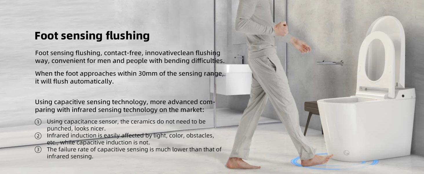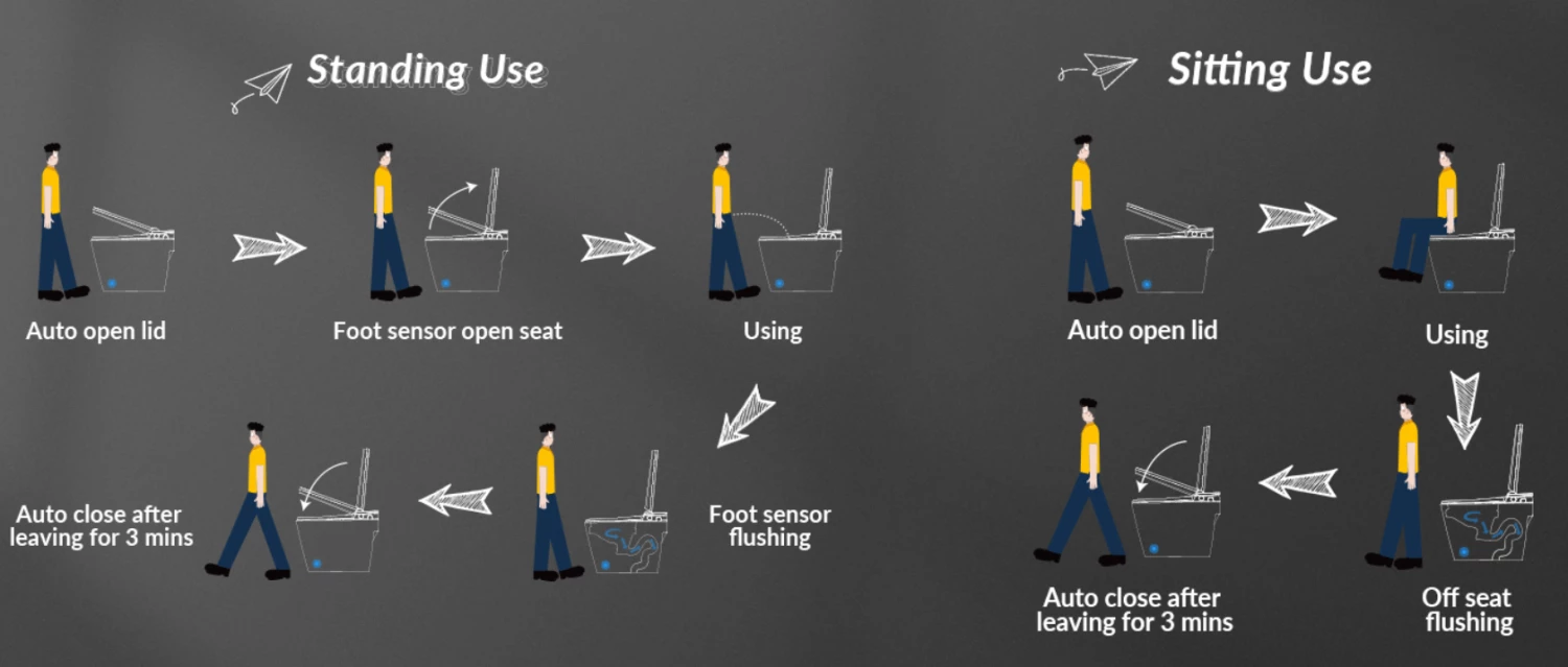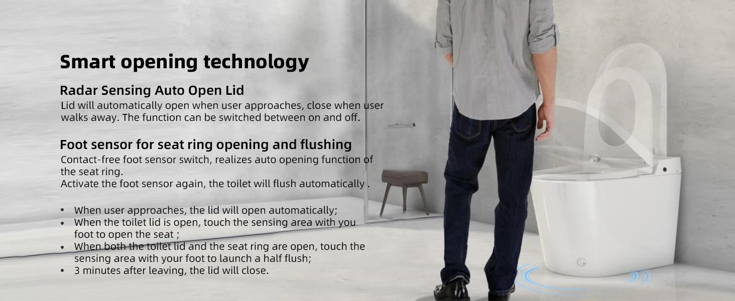 ✅ [FOOT SENSOR OPERATION]: Touching the foot sensor zone to open/close the lid and seat, following by automatically flushing after 3 minutes of department. Really a hand free operation design.