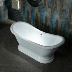 WOODBRIDGE 69 1/4″ Acrylic Double Slipper,Pedestal Freestanding Tub With Pre-Drilled 7″ Centers Faucet Holes And Brushed Nickel Overflow & Drain Option, B1539