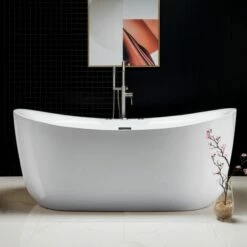 WOODBRIDGE 67″ Acrylic Freestanding Bathtub Contemporary Soaking Tub With Brushed Nickel Overflow And Drain,White Tub,B-1608-B/N-Drain&O