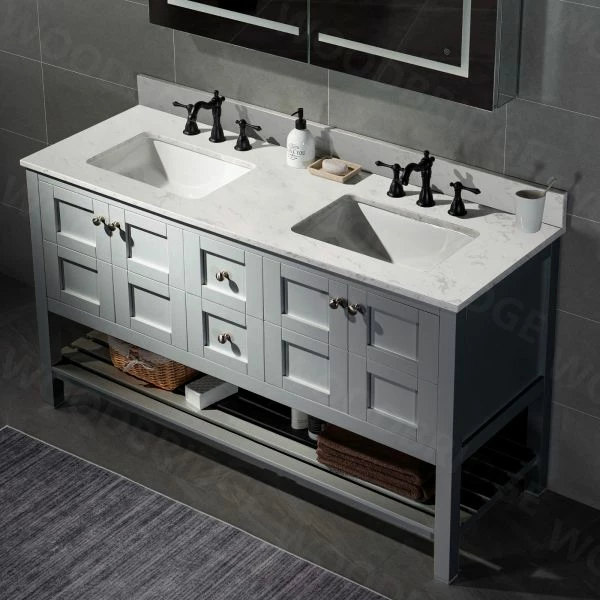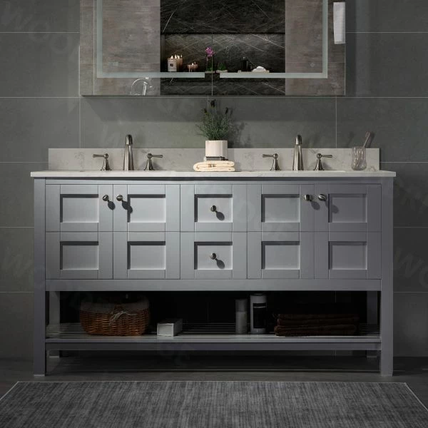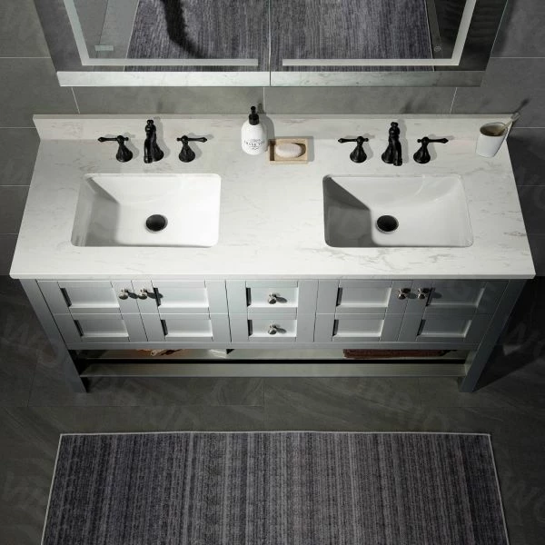 β [DIMENSIONS]: Vanity dimensions: 60″ L x 21″ W x 33″ H; Engineered Stone Composite white carrara finish vanity top dimensions: 61″ L x 22″ W; Assembled dimensions with top and back splash: 61″ W x 22″ D x 38″ H