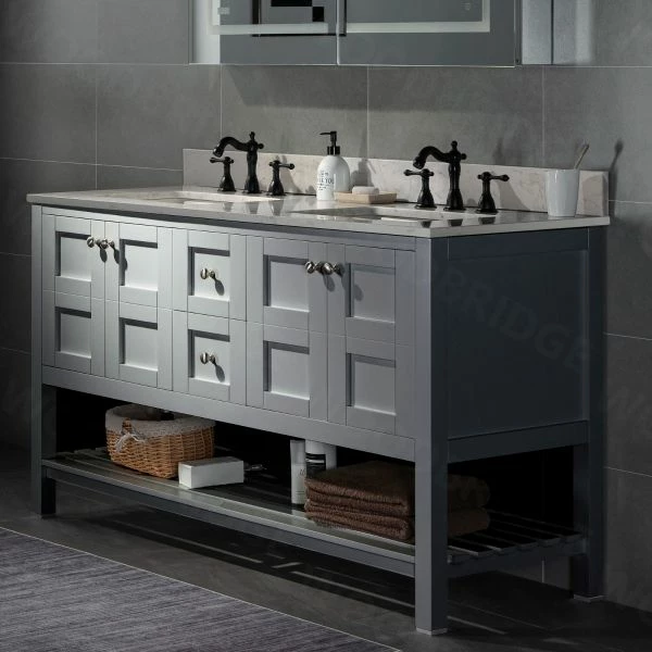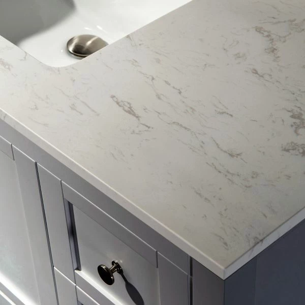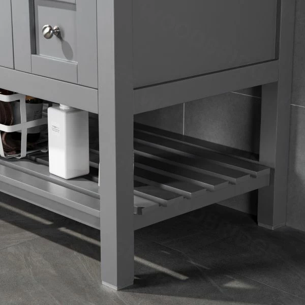 β [RELIABLE and PERFORMANCE]: Soft-closing hinges and slides on drawers and doors ensures to open and close your cabinet in quiet without noise, preventing damage to the sides around it. Dovetail jointed drawers with undercount slide; Brushed Nickel door knobs a perfect match to contemporary bathroom decor. Woodbridge grey cabinet finish with color matching interior.