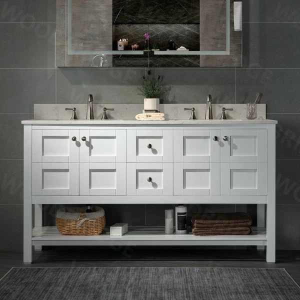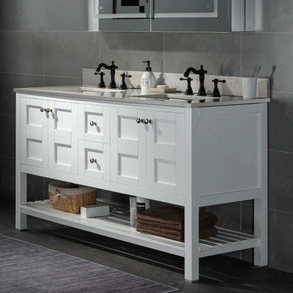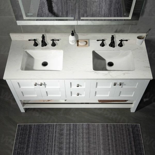 โ [DIMENSIONS]: Vanity dimensions: 60″ L x 21″ W x 33″ H; Engineered Stone Composite white carrara finish vanity top dimensions: 61″ L x 22″ W; Assembled dimensions with top and back splash: 61″ W x 22″ D x 38″ H
