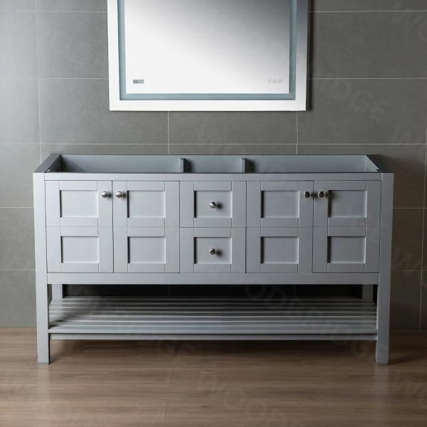 β [DIMENSIONS]: Vanity dimensions: 60″ L x 21″ W x 33″ H; Carrara white marble vanity top dimensions: 61″ L x 22″ W; Assembled dimensions with top and back splash: 61″ W x 22″ D x 38″ H