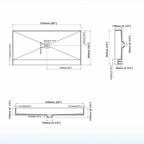 ✅️[DIMENSIONS]: Woodbridge Tillable Shower base SBR6034 60″ L x 34″ W x 6 1/4″ H