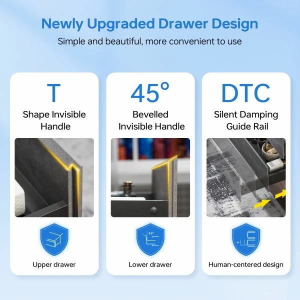 ✅ [SOFT CLOSING AND INVISIBLE HANDLE DRAWER] soft-closing drawer slides make open or close quietly without any slamming noise, both large upper and lower drawer designed with 45° beveled invisible handle which is more fit for fingers and easy to use.