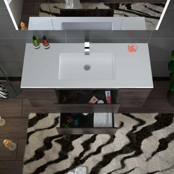 ✅ [WHITE RESIN INTEGRATED VANITY TOP & SINK] Vanity top surface covered by nanometer white crystal particles showcases a contemporary look perfect for modern aesthetics. The integrated ultra-thin sink is easy to clean, scratch-resistant, and high-temperature resistant.