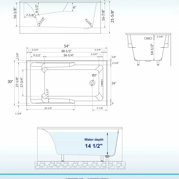 ✅ [DIMENSIONS AND SPECIFICATIONS]: External Dimension: (L) 54″ x (W) 30″ x (H) 21-5/8″,Internal Dimension:(L) 48-1/2″ x (W) 24″ x (D1)16-1/8″ x (D2)16-7/8″,Seating Area:(L) 36-1/4″ x (W)17-3/4″.Integral front skirt and tiling flange for easy installation.