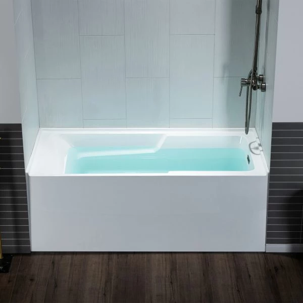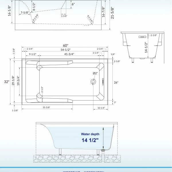 ✅ [DIMENSIONS AND SPECIFICATIONS]: External Dimension:(L) 60″ x (W) 32″ x (H) 21-5/8″,Internal Dimension:(L) 54-1/2″ x (W) 26″ x (D1)16-1/8″ x(D2) 16-7/8″, Seating Area:(L) 41-3/4″ x (W)19-3/4″.Integral front skirt and tiling flange for easy installation.