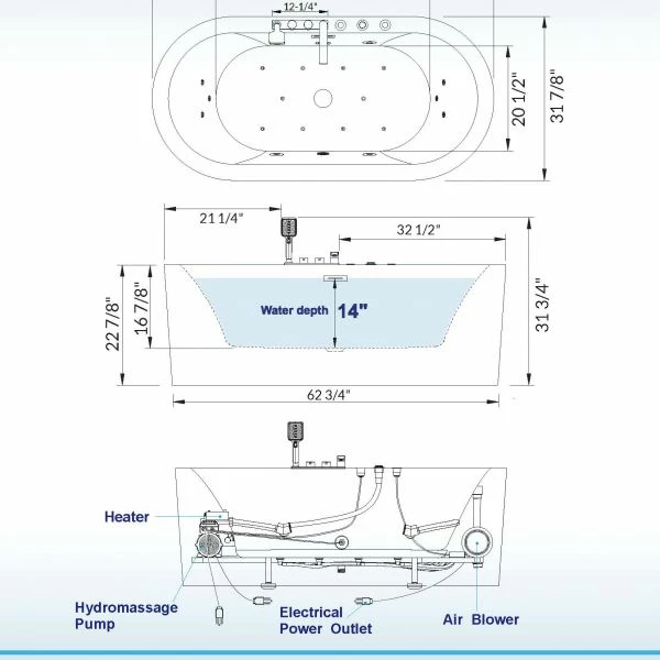 ✅[DIMENSIONS AND SPECIFICATIONS]: Exterior Dimension: 66-1/2″ L x 31-7/8″ W x 22-7/8″ D – Effective Tub Capacity: 59 Gallons; Seating Dimension: 41-3/4″ L x 20-1/2″ W, Water Depth to Overflow: 14″. Power Requirements: 3 Dedicated 15AMP 120V Outlet
