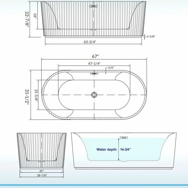 ✅ [DIMENSIONS AND SPECIFICATIONS]: Exterior dimensions: 67″ Length x 31-1/2″ Width x 22-7/8″ Height;Internal dimensions: 47-1/4″Length x 21-5/8″ Width; Water Depth to Overflow: 18″ Deep. – Effective Tub Capacity: 79 Gallons.