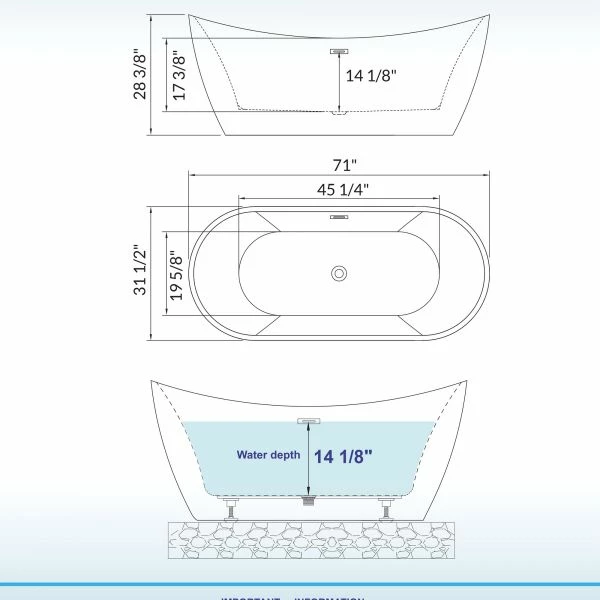 ✔ [DIMENSIONS AND SPECIFICATIONS]: 71 inch L x 31 1//2 inch w x 28 3/8” H; capacity: 60 gallons; max water depth (to overflow): 13 3/4 inch