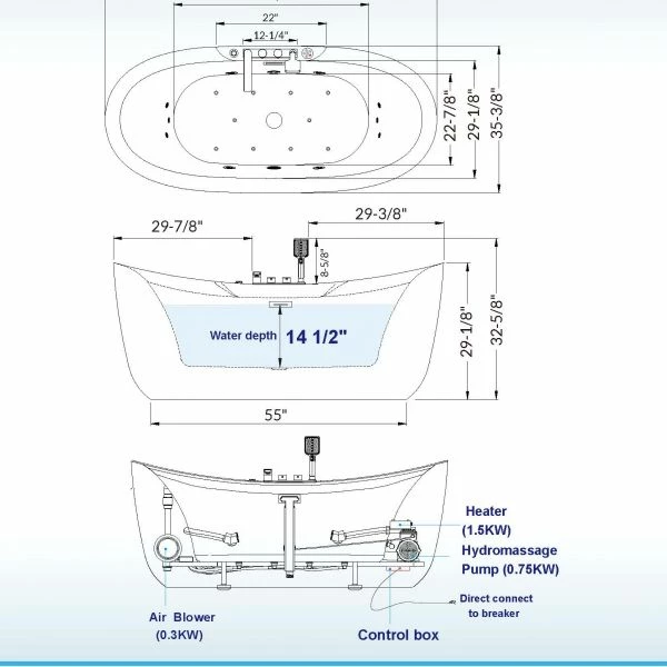 ✅[DIMENSIONS AND SPECIFICATIONS]: Exterior Dimension: 72″ L x 35-3/8″ W x 29-1/8″ D – Effective Tub Capacity: 65 Gallons; Seating Dimension: 41-3/4″ L x 22-7/8″ W, Water Depth to Overflow: 14-1/2″. Power Requirements: 1 Dedicated 120V 30AMP Breakers