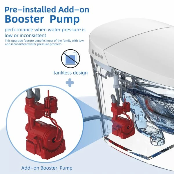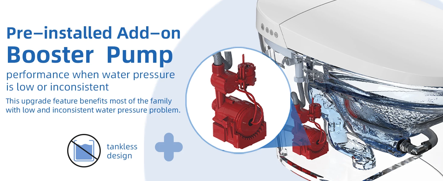 ✅ [TANKLESS AND BOOSTER PUMP]: Spacious tankless design directly uses water from water pipe, and booster pump improves flush performance at low or inconsistent water pressure, operated on water pressure greater than 0.07 Mpa (dynamic) or 0.8 Mpa (static)