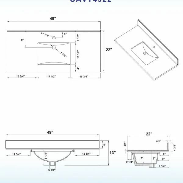 - ✔️ [ DIMENSIONS ]: Exterior Dimension: 49″ wide x 22″ deep . Fits Most Standard 48-in W x 21-in D vanity cabinet , single center faucet holes