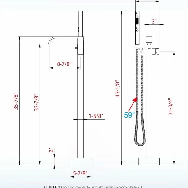 ✅ [ DIMENSIONS AND SPECIFICATIONS ]: Overall Size : (L) 5-8/7 ” x (W) 5-8/7 ” x (H) 43-1/8″. Spout Height: 35-7/8″, Spout Reach: 8-7/8″, Spout Clearance: 33-7/8″
