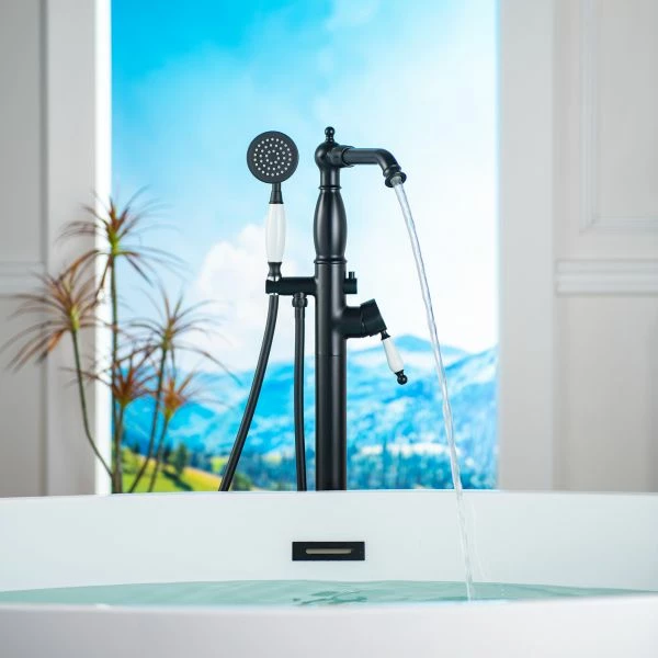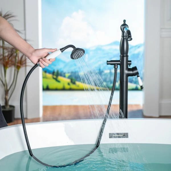 [ PACKAGE CONTENT]: Contain bathtub faucet (crafted from solid brass), brass tube, hand shower with durable PVC hose, Hot and Cold water inlet hoses, metal tripod with mounting hardware, Base Cover and installation instruction.