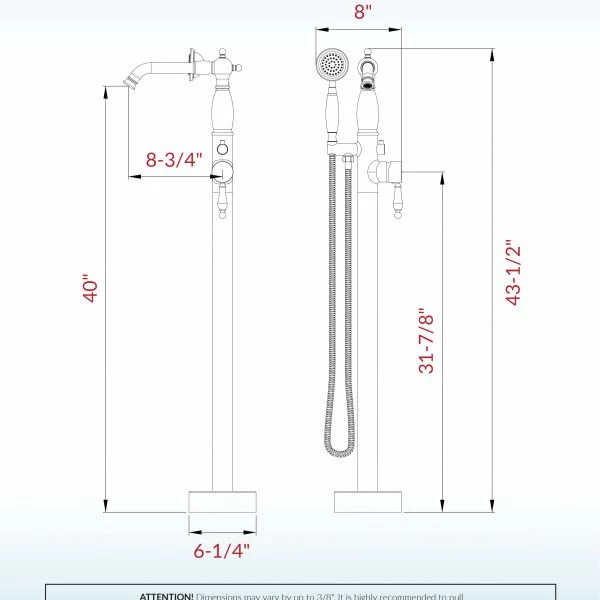 [ DIMENSIONS AND SPECIFICATIONS ]: Overall Size : (L) 6-1/4″ x (W) 6-1/4″ x (H) 43-1/2″. Spout Height: 43-1/2″, Spout Reach: 8-3/4″, Spout Clearance: 40″