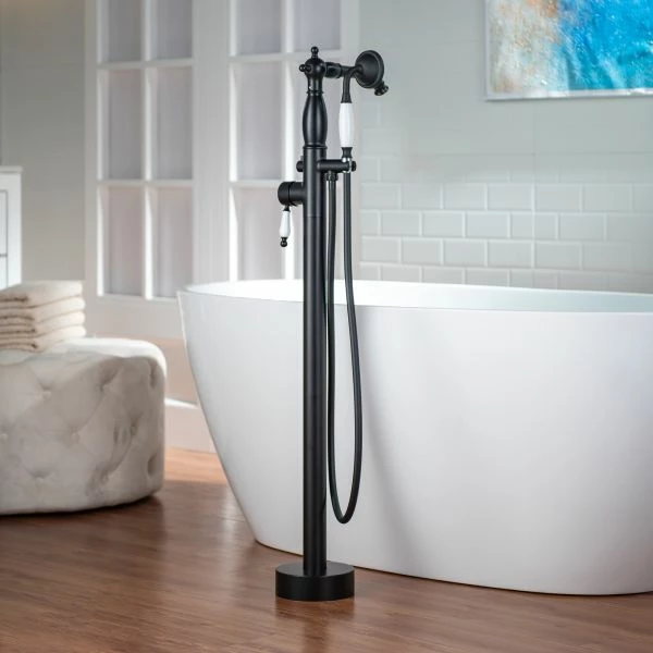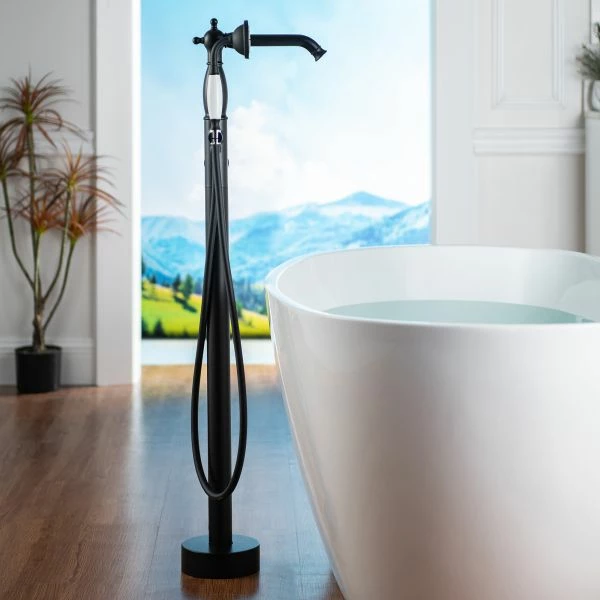 [ DESIGN INSPIRATION ]: Quick freestanding mount to floor design, easy operation single handle design allows flow rate and temperature control in single hand. Low arch 360 degree rotation swivel spout offers more room for bathing activities.