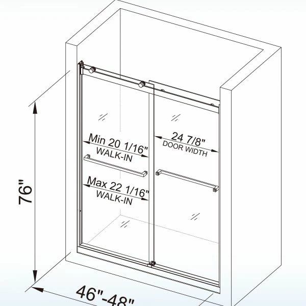 ✅ [DIMENSIONS AND FINISH]: 46-48″ inch Width adjustable x 76 inch Height, Door Width: 24 7/8 inch, Walk-in: 20 1/16-22 1/16 inch. Aluminum top guide bar can be trimmed up to 4 in. for width adjustment