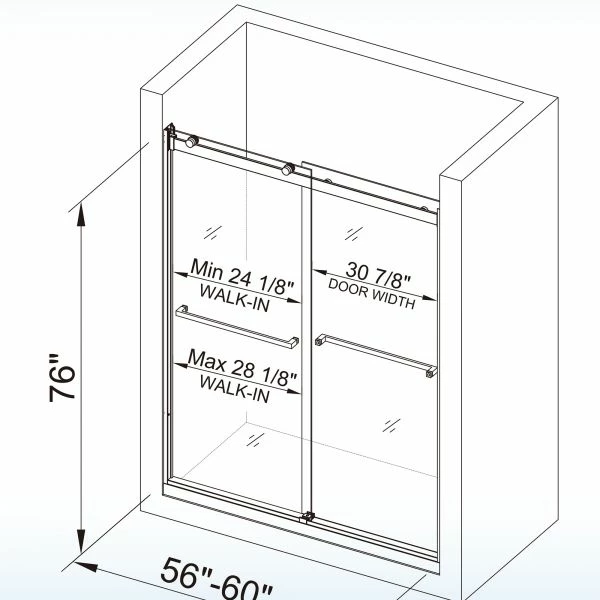 ✅ [DIMENSIONS AND FINISH]: 56-60″ inch Width adjustable x 76 inch Height, Door Width: 30 7/8 inch, Walk-in: 24 1/8-28 1/8 inch. Aluminum top guide bar can be trimmed up to 4 in. for width adjustment
