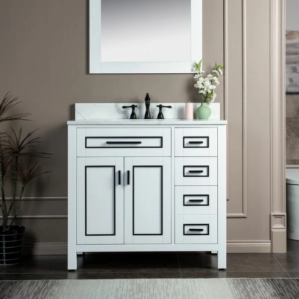 โ [DIMENSIONS]: Vanity dimensions: 36″ L x 21.5″ W x 33″ H; Engineered Stone Composite vanity top dimensions: 37″ L x 22″ W; Assembled dimensions with top and back splash: 37″ W x 22″ D x 38″ H