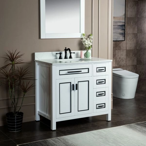 โ [RELIABLE and PERFORMANCE]: Soft-closing hinges and slides on drawers and door ensures to open and close your cabinet in quiet without noise, preventing damage to the sides around it. Dovetail jointed drawers with undercount slide; Black door knobs a perfect match to contemporary bathroom decor. Inside and outside of the cabinet are painted with matching finish of high-quality low-odor paint in layers.