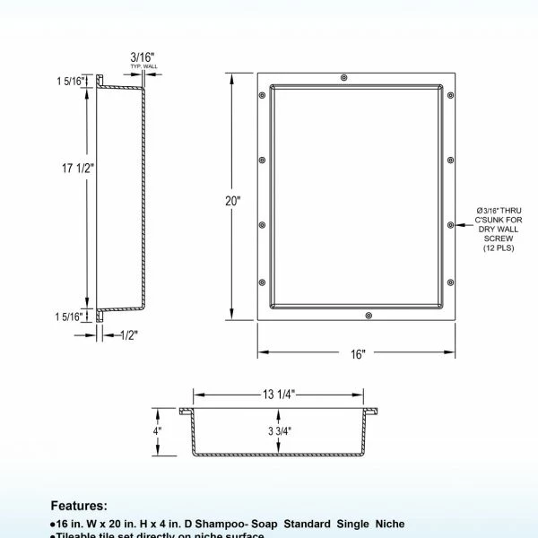 EASY INSTALLATION: Flush Mount with Cement Board Installation. Niche shower that is fully sealed, hassle-free, quick and simple installation. It can be install vertically or horizontally to suit your needs and design.