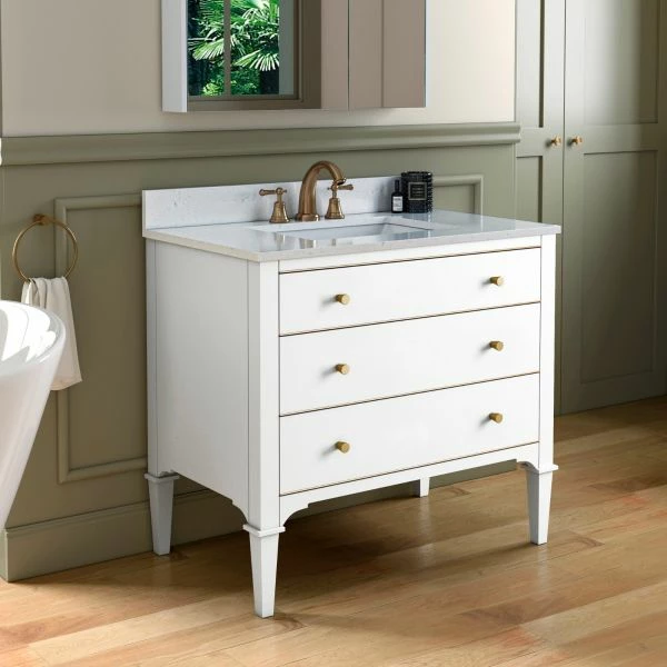 ✅ [RELIABLE and PERFORMANCE]: Soft-closing hinges and slides on drawer ensures to open and close your cabinet in quiet without noise, preventing damage to the sides around it. Dovetail jointed drawers with undercount slide; Brushed Gold door knobs a perfect match to contemporary bathroom decor. Inside and outside of the cabinet are painted with matching finish of high quality low-odor paint in layers. Comes with adjustable height levelers.
