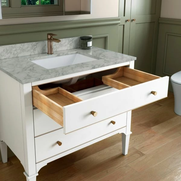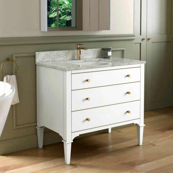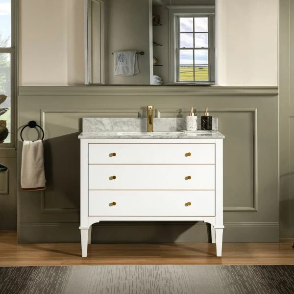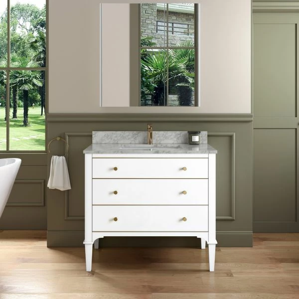 ✅ [RELIABLE and PERFORMANCE]: Soft-closing hinges and slides on drawer ensures to open and close your cabinet in quiet without noise, preventing damage to the sides around it. Dovetail jointed drawers with undercount slide; Brushed Gold door knobs a perfect match to contemporary bathroom decor. Inside and outside of the cabinet are painted with matching finish of high quality low-odor paint in layers. Comes with adjustable height levelers.