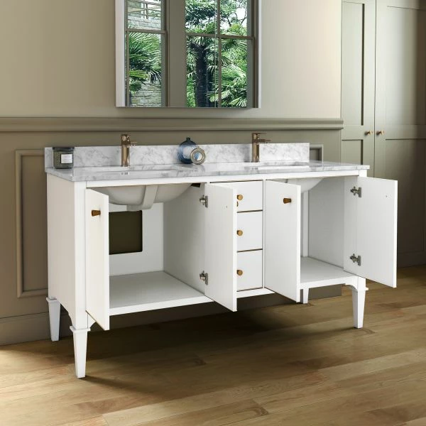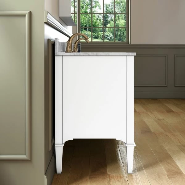 ✅ [RELIABLE and PERFORMANCE]: Soft-closing hinges and slides on drawer ensures to open and close your cabinet in quiet without noise, preventing damage to the sides around it. Dovetail jointed drawers with undercount slide; Brushed Gold door knobs a perfect match to contemporary bathroom decor. Inside and outside of the cabinet are painted with matching finish of high quality low-odor paint in layers. Comes with adjustable height levelers.