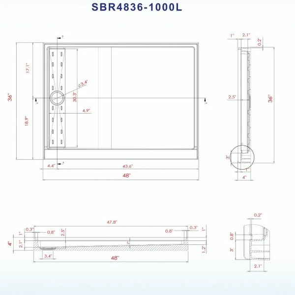 ✅️[DIMENSIONS]:WOODBRIDGE Solid Shower Base SBR4836-1000L 48″ L x 36″ W x 4″ H, Left Drain