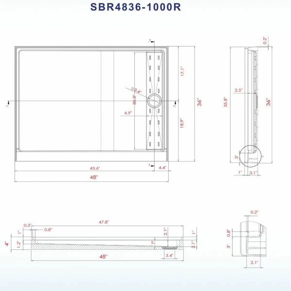 ✅️[DIMENSIONS]:WOODBRIDGE Solid Shower Base SBR4836-1000R 48″ L x 36″ W x 4″ H, Right Drain