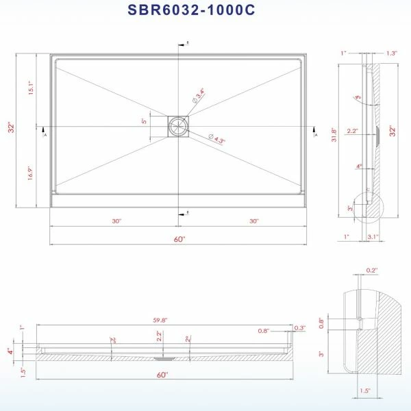 ✅️[DIMENSIONS]:WOODBRIDGE Solid Shower Base SBR6032-1000C 60″ L x 32″ W x 4″ H, Center Drain