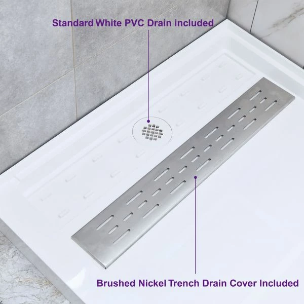 INCLUDED]: Shower base, Brushed Stainless Steel trench drain cover,