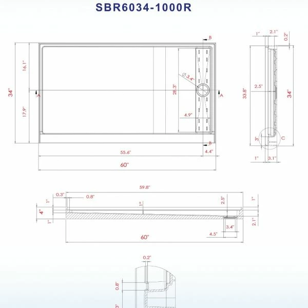 ✅️[DIMENSIONS]:WOODBRIDGE Solid Shower Base SBR6034-1000R 60″ L x 34″ W x 4″ H, Right Drain