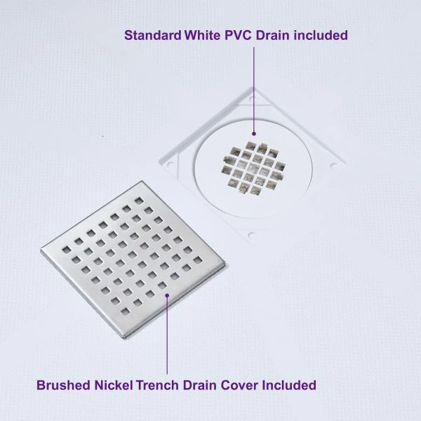 INCLUDED]: Shower base, Brushed Stainless Steel trench drain cover,
