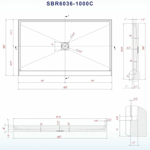 ✅️[DIMENSIONS]:WOODBRIDGE Solid Shower Base SBR6036-1000C 60″ L x 36″ W x 4″ H, Center Drain
