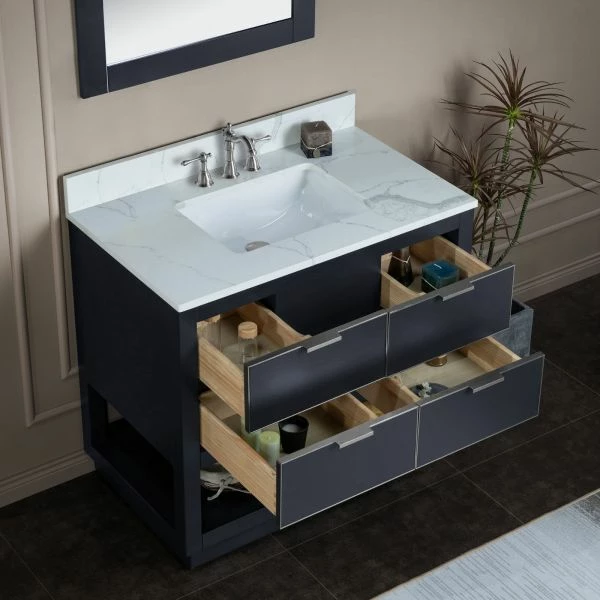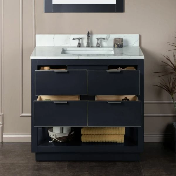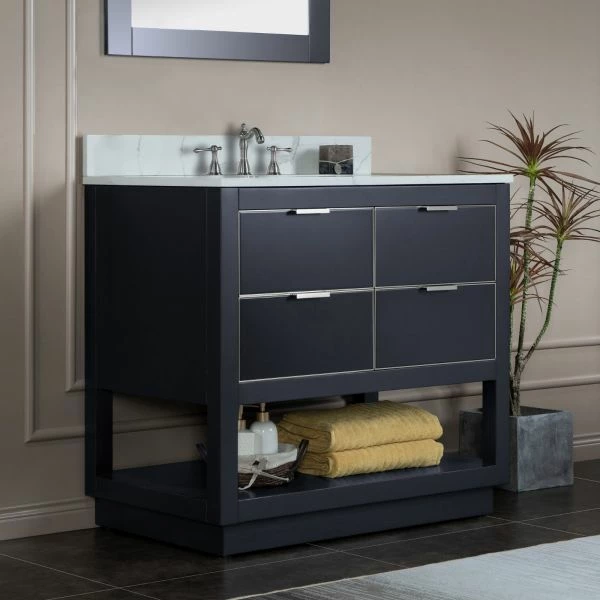 WOODBRIDGE Venice 36″x21″x33″ Solid Wood Bath Vanities Side Cabinet In Grey With Brushed Nickel Trim And Engineered Stone Composite Vanity Top In Fish Belly White With 3 Pre-Drilled Holes For 8-inch Widespread Faucet.