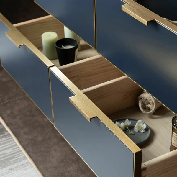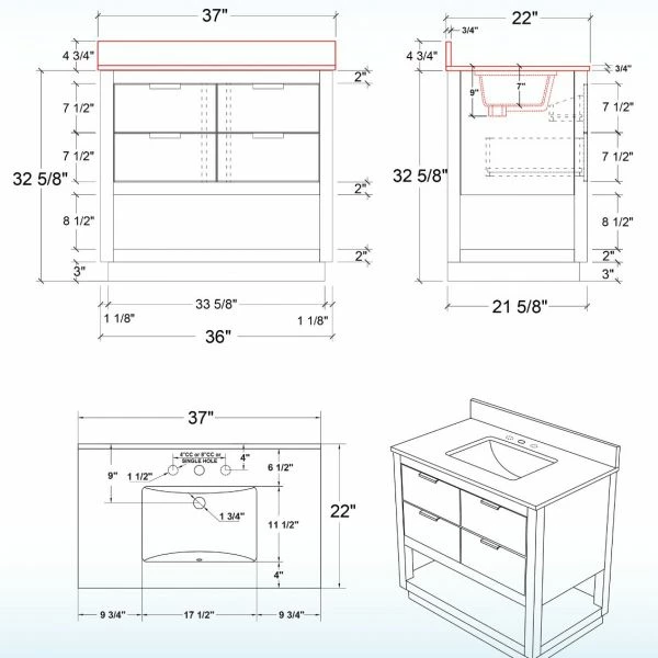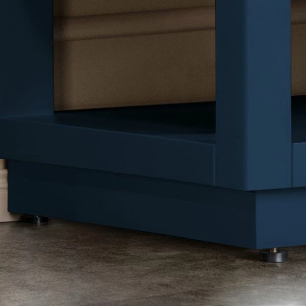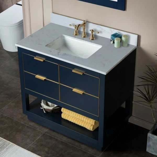 WOODBRIDGE Venice 36″x21″x33″ Solid Wood Bath Vanities Side Cabinet In Navy Blue With Gold Trim And Engineered Stone Composite Vanity Top In Carrara White 3 Pre-Drilled Holes For 8-inch Widespread Faucet.