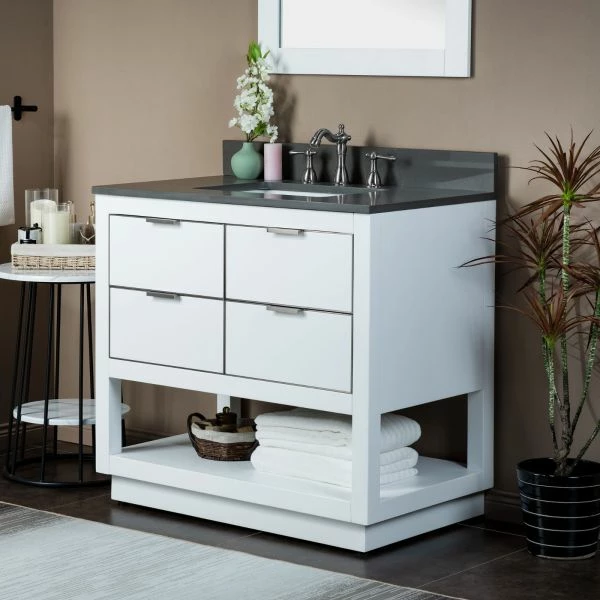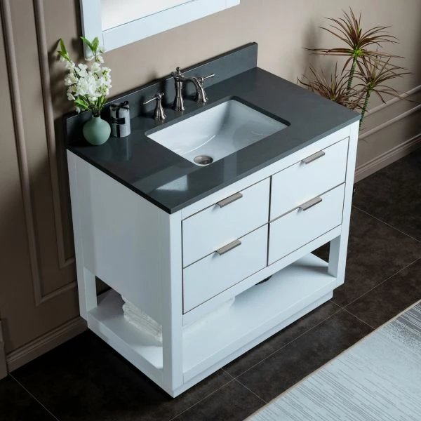 WOODBRIDGE Venice 36″x21″x33″ Solid Wood Bath Vanities Side Cabinet In White With Brushed Nickel Trim And Engineered Stone Composite Vanity Top In Dark Gray With 3 Pre-Drilled Holes For 8-inch Widespread Faucet.