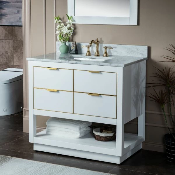 โ [DIMENSIONS]: Vanity dimensions: 42″ L x 21.5″ W x 33″ H; Carrara white marble vanity top dimensions: 43″ L x 22″ W; Assembled dimensions with top and back splash: 43″ W x 22″ D x 38″ H