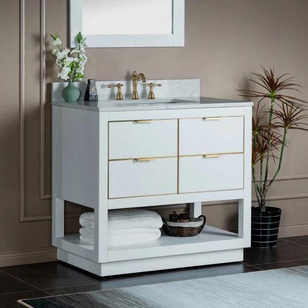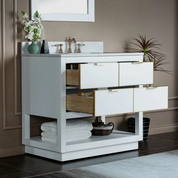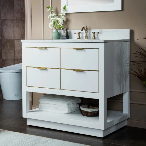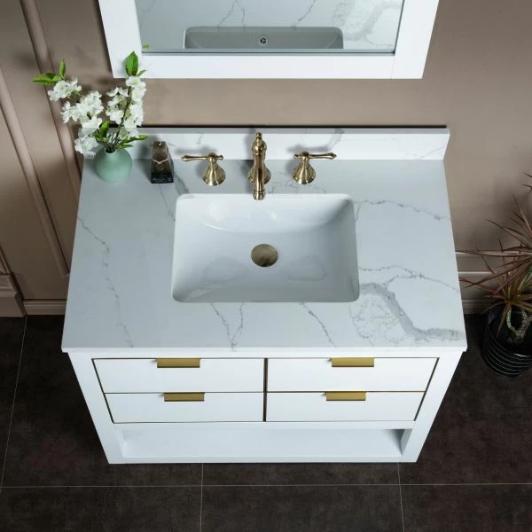 WOODBRIDGE Venice 42″x21″x33″ Solid Wood Bath Vanities Side Cabinet In White With Gold Trim And Engineered Stone Composite Vanity Top In Fish Belly White With 3 Pre-Drilled Holes For 8-inch Widespread Faucet.