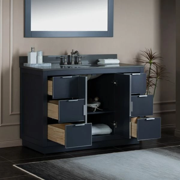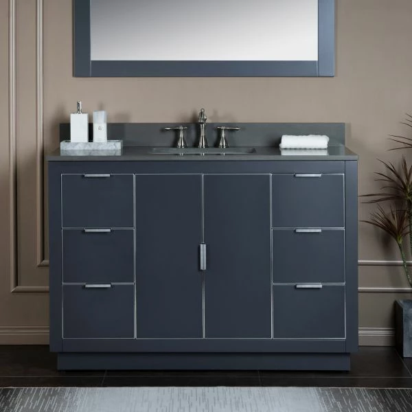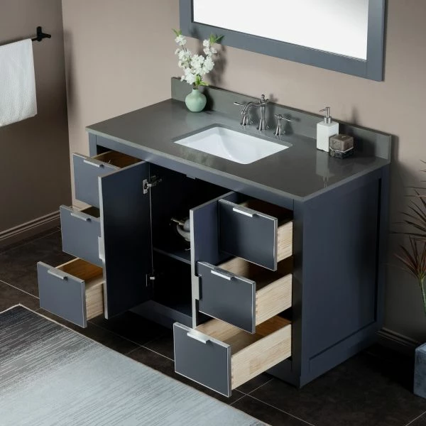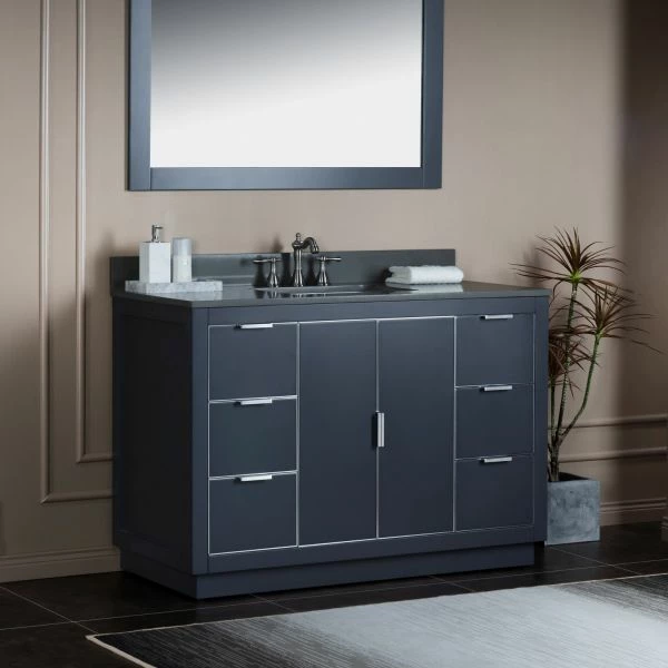 โ [DIMENSIONS]: Vanity dimensions: 48″ L x 21.5″ W x 33″ H; Engineered Stone Composite vanity top dimensions: 49″ L x 22″ W; Assembled dimensions with top and back splash: 49″ W x 22″ D x 38″ H